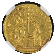 表面にはドージェ(イタリア語で国家元首を指す言葉)が聖マルコに跪いていて、裏面はキリストが描かれています。 ゼッキーノの金含有量は時代によってまちまちであったが、平均3.494から3.559グラムの重量で純金でありました。(997‰)