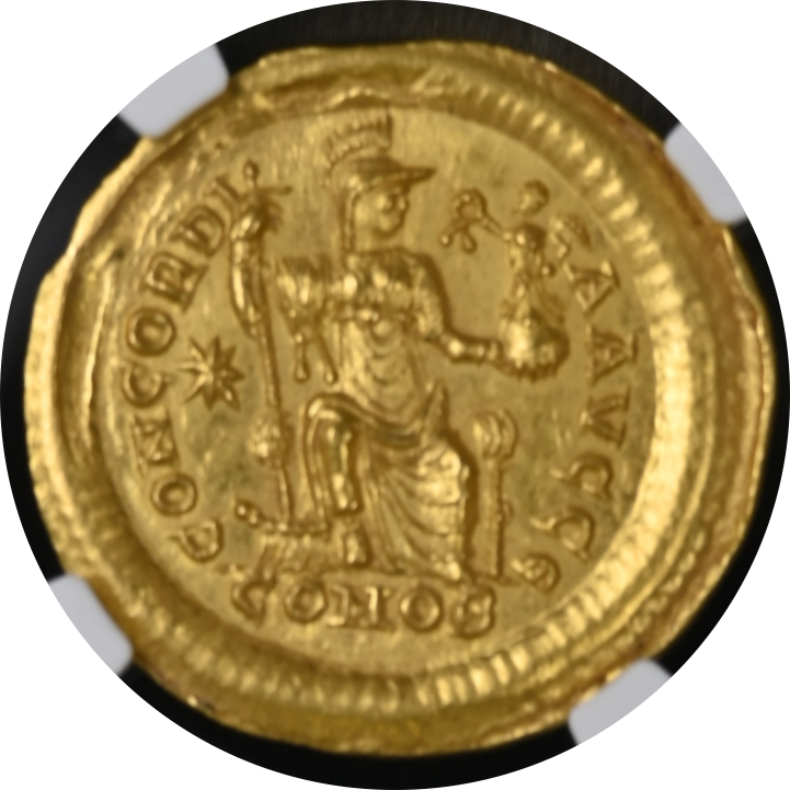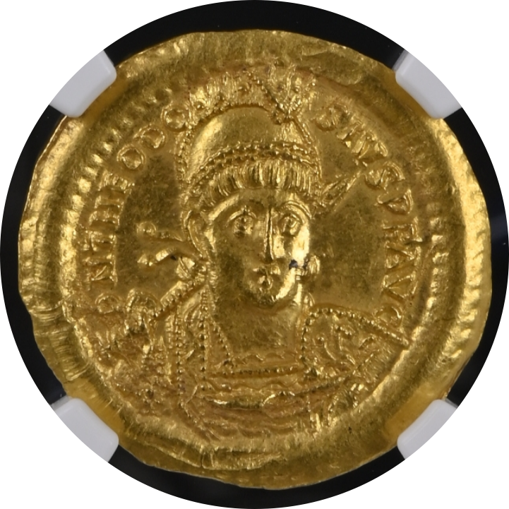 同タイプのソリダス金貨は鑑定例が一定数存在しますが、「★」評価付きは限られています。特にStrike(打刻)が満点の5/5を獲得している点は、当時の鋳造技術の高さと保存状態の良さを示す証です。柔らかな金の光沢と鮮明な肖像を兼ね備えた本品は、数あるテオドシウス2世期ソリダスの中でも、美観と保存度の両立に優れた貴重な一枚といえます。