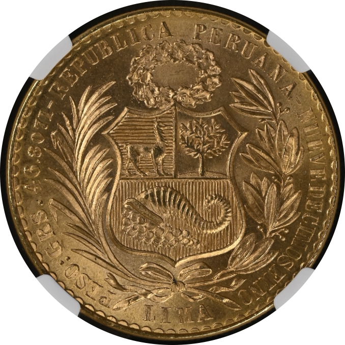 銘文:PESOS : GRS. 46.8071 - REPUBLICA PERUANA - NUEVEDECIMOSFINO LIMA