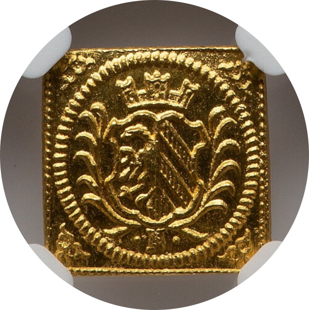 さらに本品は、四角形のフラン型をそのまま切り出した特別仕様「クリッペ(Klippe)」として製造された一点です。通常の円形金貨とは異なる独自のフォルムは、当時のドイツ圏においては一般的には緊急通貨として使われる他、祝祭・記念・献呈用として限られた場でのみ発行された特別な存在であり、その発行形態自体が希少価値を高めています。