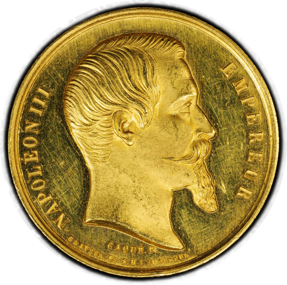 さらに、本メダルはPCGSによって「MS61」と認定された世界で唯一の登録品であり、160年以上を経ても発行当時に近い輝きを保っています。こうした高鑑定の金製授与メダルが現存する例は極めて稀であり、フランス国内外のオークション市場でも滅多に姿を見せません。