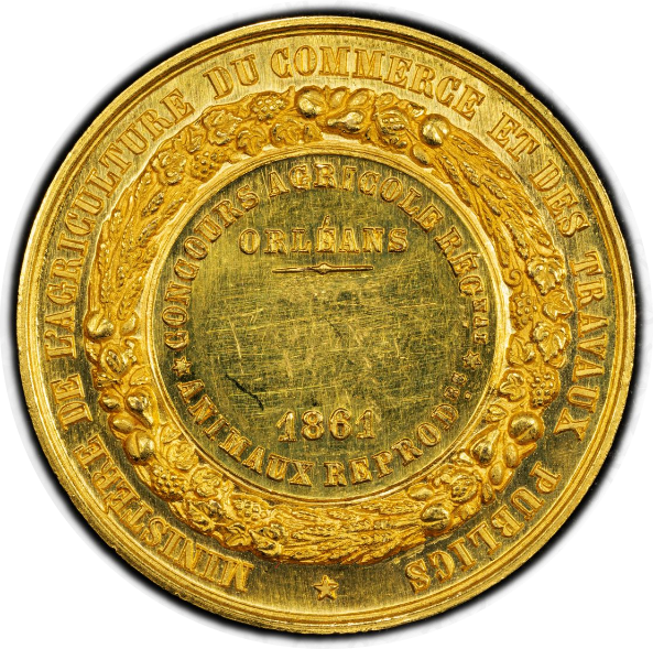 本メダルは、1861年に開催されたオルレアン農業コンクールで授与された「国家授与メダル」であり、現存が確認されるのは本品1枚のみです。