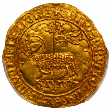 現存するアニェル・ドール(ムートンドール)金貨はごく僅かであり、特にシャルル6世期の発行分は流通量が極めて少なかったため、市場で姿を見ることはほとんどありません。PCGS鑑定でも本品は世界に1枚のみの登録(トップポップ)という、比類なき希少性を誇ります。さらに、この金貨は1960年代にフランスで発見された「ラ・リュセルヌ修道院の財宝」に含まれていた由緒ある一枚で、1982年以来、市場に再登場することすら稀な伝説的存在です。