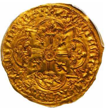 シャルル6世治世末期、金貨の発行が一時的に再開されたわずかな期間にのみ鋳造されたとされ、当初から流通量が極めて限られていました。その後、度重なる内乱や通貨改鋳の影響で多くが溶融され、今日まで完存する例はほとんど確認されていません。