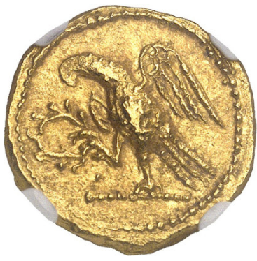 その意匠は、ローマ共和政デナリウスの影響を色濃く受けた完成度の高い構成となっています。表面には執政官を先頭に二人のリクトルが行進する荘厳な場面が描かれ、共和政ローマの権威と秩序を象徴的に表現しています。裏面には笏の上にとまる軍鷲と月桂冠が配され、勝利・正統性・権力の正当性という明確なメッセージが読み取れます。これらの図像は偶然の産物ではなく、当時の政治思想や権力構造を意図的に可視化したものであり、金貨でありながら第一級の歴史資料としての価値も備えています。