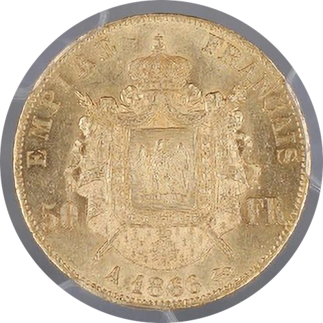 1866年にパリ造幣局で発行されたナポレオン3世の50フラン金貨は、当時およそ3万9千枚が鋳造されたとされています。しかし、その多くは実際に流通に供されたため、今日まで良好な状態で残存しているハイグレード品はごくわずかです。