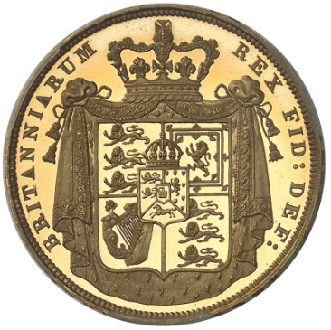 本貨は、ジョージ4世の治世を象徴する伝説的な「1826年プルーフセット」に含まれる、歴史的に極めて重要な一枚です。本来、貨幣は広く流通するために大量発行されますが、このセットは王室の儀礼や限られた要人への贈呈用として特別に鋳造された非流通貨でした。公式記録上では450枚の発行とされていますが、実質的な製造数はわずか150セット程度とも推定されており、発行当時から一般市場に出回ることのなかった「幻の金貨」として知られています。