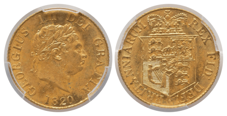 本貨の特徴は、1816年の貨幣改革によって誕生した近代1/2ソブリンシリーズにおいて、突出して発行枚数が少ない「1820年」銘であるという点に尽きます。