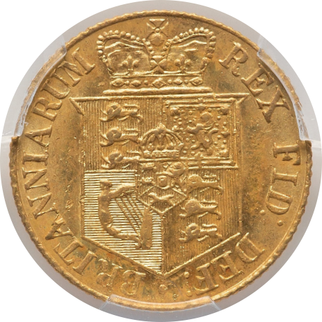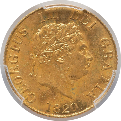 本品が発行された1820年は、ナポレオン戦争終結後の社会が落ち着きを取り戻し、英国が金本位制のもとで経済基盤を整えていく過程にあたる時期です。この時代に君臨したジョージ3世は、旧来のギニー金貨と新制度下のソブリン金貨の双方に肖像が刻まれた唯一の国王として知られ、貨幣制度の転換期を象徴する存在といえます。
